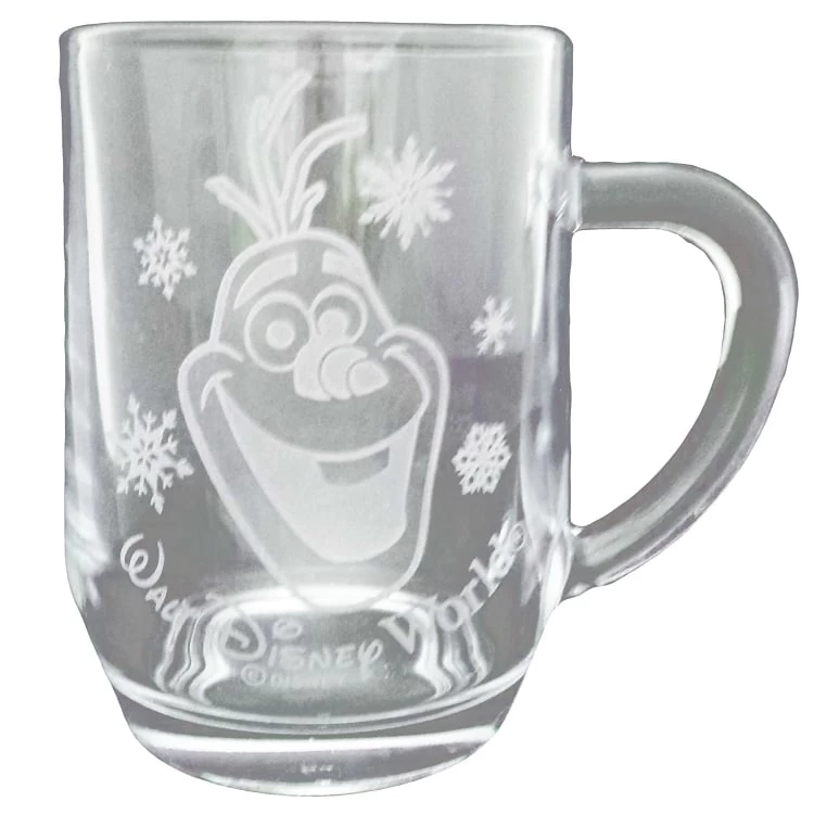 Enjoy a cool refreshing drink from this Olaf Glass Mug. Created by Arribas Brothers, this mug features an etched image of the Frozen character, and Walt Disney World logo, and can be personalized to make a unique present.