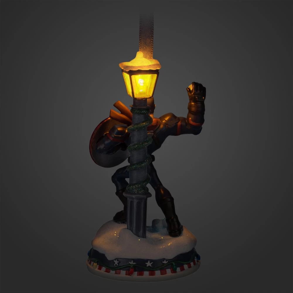 Don’t get into a snowball fight with Captain America as he has a protective shield at the ready (and a good throwing arm to boot). This fully sculpted holiday ornament features scenic lighting from the street lamp above, making the snow drifts sparkle like stars on a blue field.