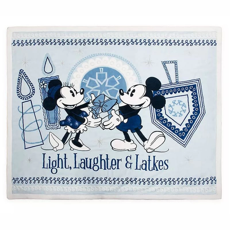Cozy up under this festive fleece throw this Chanukah for all eight nights. Mickey and Minnie exchange gifts on the front of this large blanket and appear atop the text ”light, laughter & latkes.” Fastened with a blue satin ribbon, this throw makes a perfect present!