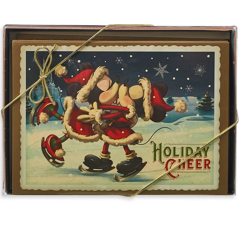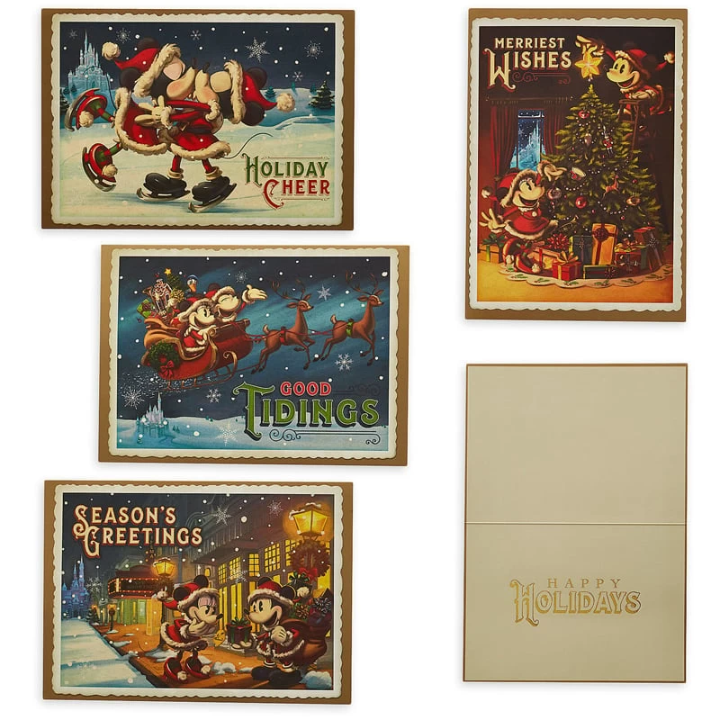 Spread holiday cheer via snail mail with these Santa Mickey and Minnie Mouse greeting cards. Featuring sixteen colorful cards inspired by vintage celebrations from yesteryear, this set is sure to spread love and joyous noel.