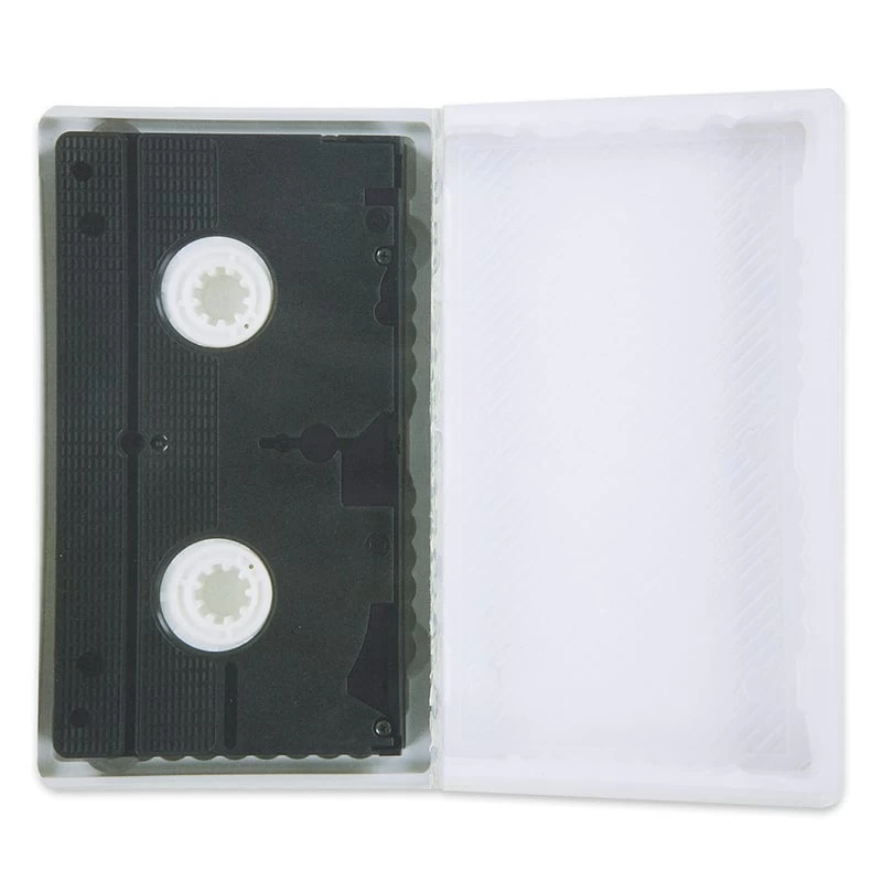 - Photographic endpapers show interior VHS clamshell case and VHS tape