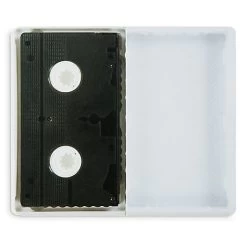 - Papers show interior VHS clamshell case and VHS tape