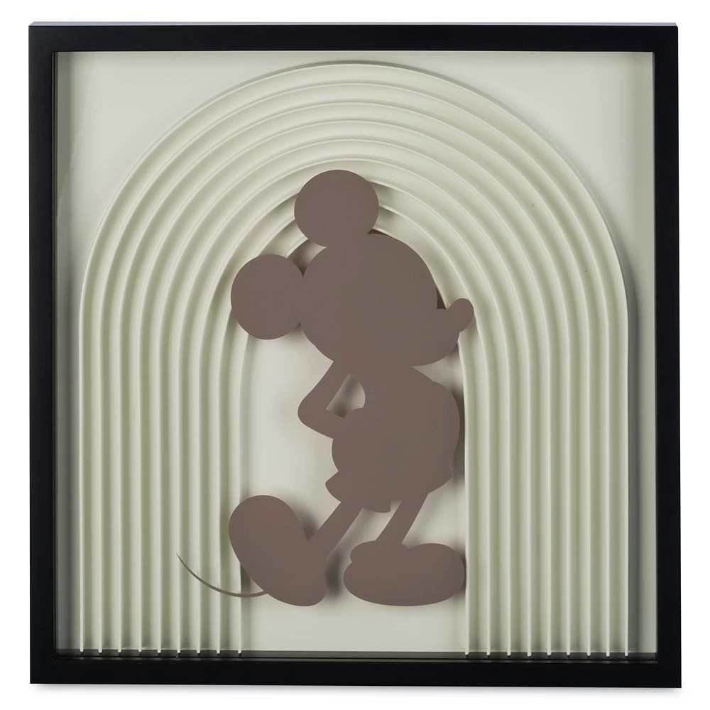 A house is not a home without the mouse. This handsome black box frame holds a gray Mickey silhouette over a stark white rainbow of three-dimensional arches. Designed to accent your coordinating decor from the Mickey Mouse Home Collection, this subtle, tasteful wall art is ready for hanging right out of the shipper.
