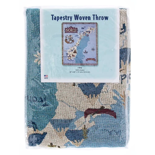Disney Woven Tapestry Throw Blanket features Goofy and Mickey Mouse as well as other EPCOT Norway Pavilion Icons and themes. NORGE meaning “Norway” in Norwegian, adorns the top left corner of this blanket. Epcot World Showcase in the bottom right corner.