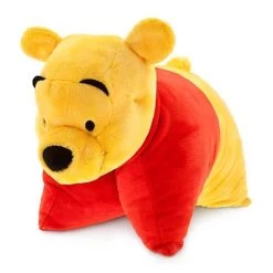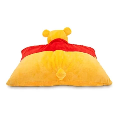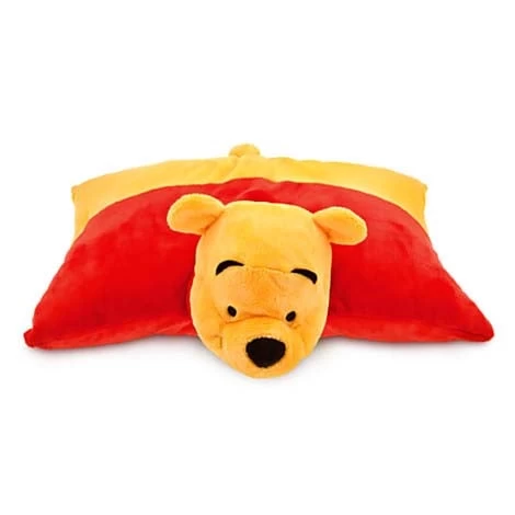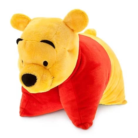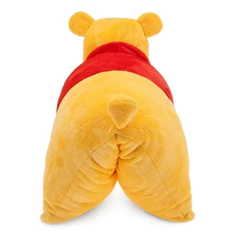 - Pooh has a self-stick fabric strap on his belly that lets you fold him over for a teddy bear look, then undo it to create a plush pillow!