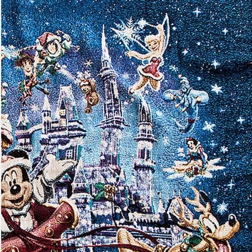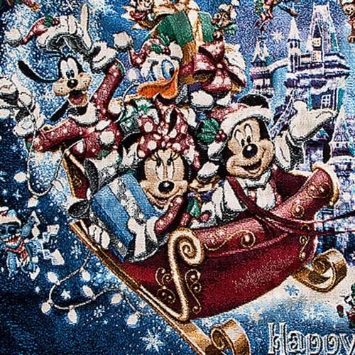 Warm-up the furniture as well as your family with this ”Happy Holidays” soft woven throw detailed with favorite Disney storybook characters and accented with glittering tinsel strands, direct from the Disney Parks. Art features Mickey Mouse, Minnie Mouse, Donald Duck, Goofy, Pluto, Jiminy Cricket, Chip an’ Dale, Tinker Bell, Peter Pan, Snow White, Alice, Dumbo, Winnie the Pooh, Genie, Stitch, Buzz Lightyear, Woody, and Duffy in front of Cinderella Castle. Happy Holidays greeting.